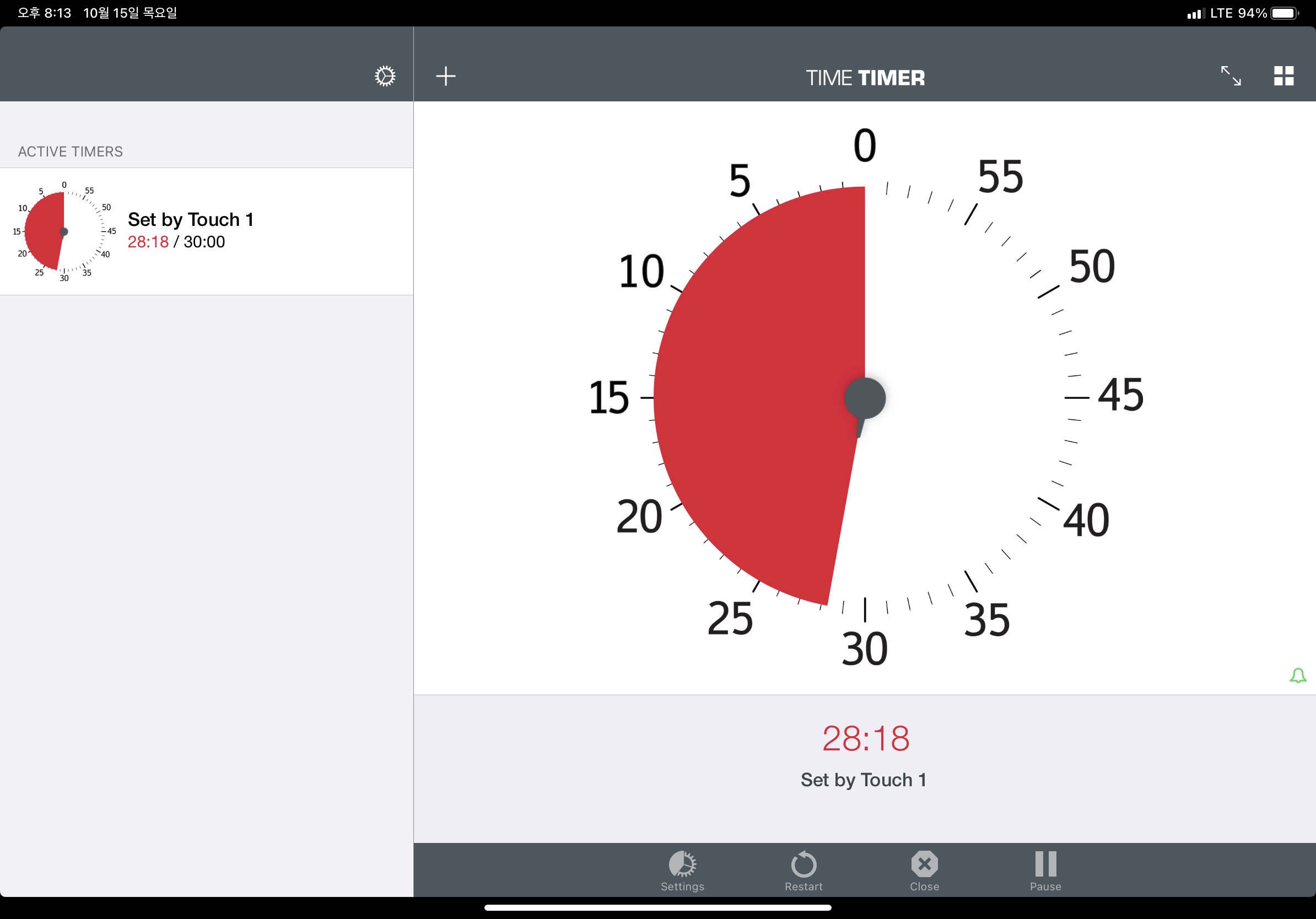 아이패드의 실행 화면입니다. 실물 타이머의 모습을 최대한 반영하고 있어요. 만약 선생님이라면, 시험시간 측정 등에 아이패드를 활용하는 것도 좋을 것 같아요. 왼쪽 창에 여러개의 타이머를 등록해 놓고 쓸 수 있으며, 시간 변경도 빨간 원을 돌려주면 즉시 값이 반영 됩니다.